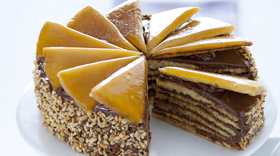 Una torta classica, gloria della pasticceria asburgica e molto amata dalla principessa Sissi, è l’ungherese Dobostorte (foto sopra), formata da sei strati sottili di pâte à biscuit, farciti da una crema al burro al cioccolato; il dolce è ricoperto poi da un caratteristico strato di caramello. Il creatore Josef Dobos, che non era un pasticciere ma proprietario di una trattoria, preparò la torta che porta il suo nome e la presentò all’Esposizione Nazionale ungherese del 1885. La ricetta ufficiale rimase segreta per molti anni, per comparire per la prima volta nel testo di riferimento più importante per l’area gastronomica della Mitteleuropa, il Manuale di Cucina di Katharina Polt: la prima edizione, in tedesco, è del 1858; nel 1892 è stato pubblicato in Italia con lo pseudonimo di Caterina Prato.