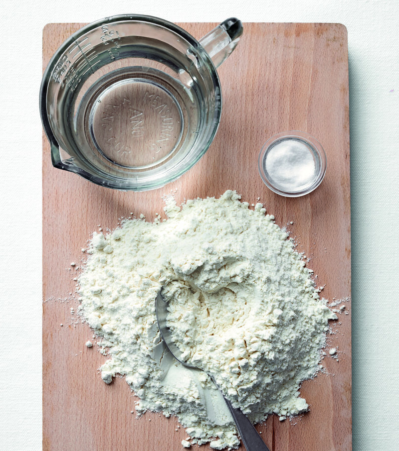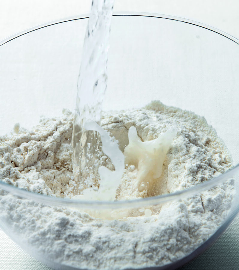 1) Versate la farina in un'ampia ciotola e incorporate 900 ml di acqua a temperatura ambiente versandola a filo e mescolando con una frusta. Quindi unite una presa di sale fino e un po' di aghi di rosmarino tritati e mescolate ancora energicamente per scioglierlo ed eliminare eventuali grumi.