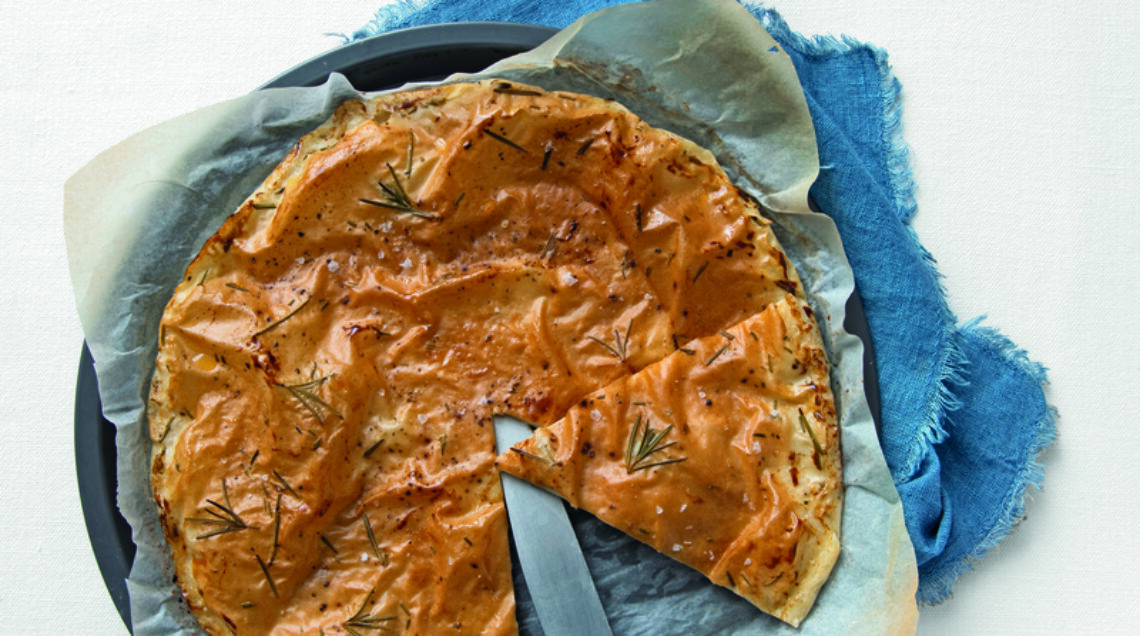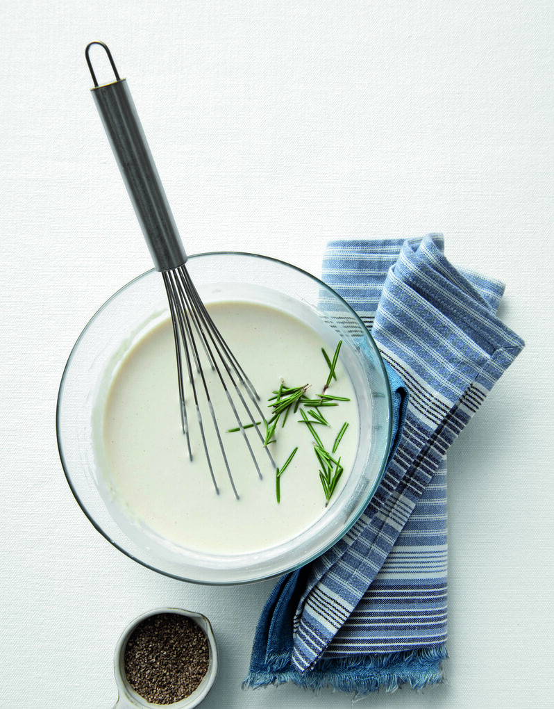 3) Scaldate una teglia di 30-35 cm di diametro in forno a 200°. Asportate la schiuma sulla superficie della miscela con una schiumarola. Foderate la teglia con carta da forno, versatevi l'olio e la miscela e mescolate per distribuire l'olio. Infornate a 200° per 10 minuti circa, o finché si sarà creata una crosticina in superficie. Sfornate e cospargete con pepe pestato, sale in fiocchi e ciuffi di rosmarino.