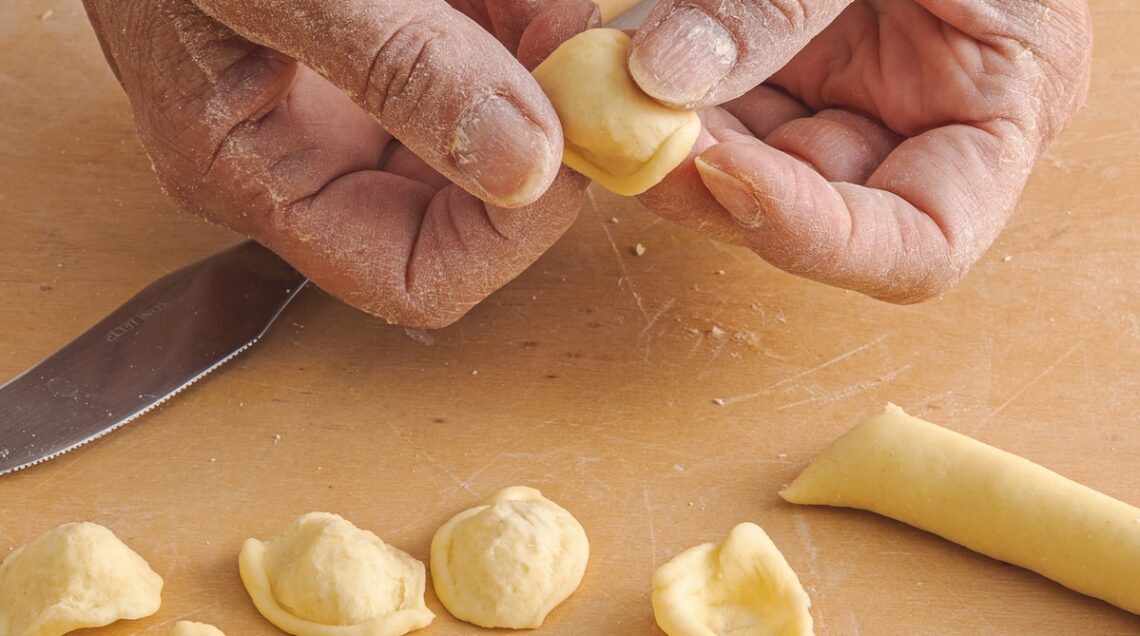Dopo questo veloce excursus storico, è il momento di mettere finalmente le mani in pasta. Per sapere come preparare le orecchiette potete fare riferimento a questo articolo. Vi troverete spiegato sia come realizzare l’impasto sia come ricavarne dei serpentelli, tagliarli in tanti piccoli pezzetti e quindi trascinarli con la punta di un coltello prima di modellarli con le dita nell’inconfondibile forma a cupoletta.