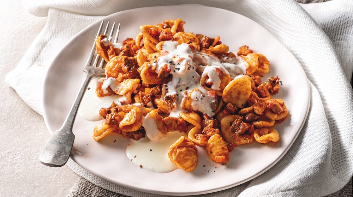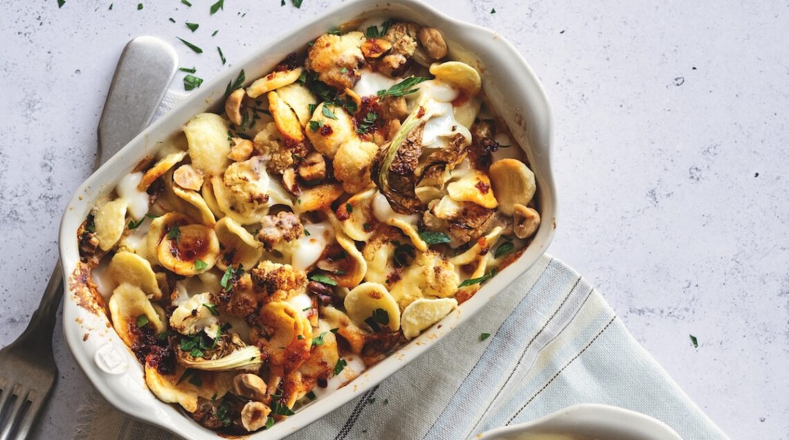 Non cambiano gli ortaggi nel caso delle orecchiette con cavolfiore arrosto, ‘nduja e nocciole (foto sopra), ma il piatto si arricchisce del gusto piccante dell’insaccato calabrese e di quello gentile dello stracchino. Con la nota croccante assicurata dalla granella di frutta secca e l’infornata finale. La gratinatura regala una irresistibile crosticina anche a queste orecchiette al forno, mentre un condimento a base di funghi cardoncelli, pancetta e pomodoro si allea alla mozzarella, al pecorino e al prosciutto nel rendere il piatto più che completo. Condite con un sugo rosso alla salsiccia e peperoncino, finiscono poi in teglia anche le orecchiette al forno con sugo piccante di pomodoro, con la provola a pezzetti e il pecorino grattugiato a creare un composto irresistibile.