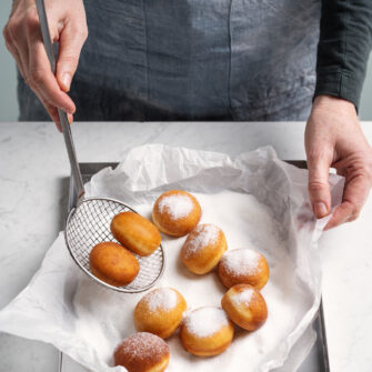 Nel primo caso, si consiglia di formarle su un foglio di carta forno e passarle in forno a 200° per 10 minuti prima di friggerle: grazie alla crosticina che si formerà, assorbiranno molto meno unto e saranno più leggere. Al termine della frittura sgocciolate le ciambelle e lasciatele raffreddare bene su fogli di carta assorbente: quando saranno a temperatura ambiente, guarnitele con crema pasticcera, cospargetele di zucchero a velo e infine decorate con amarene sciroppate.