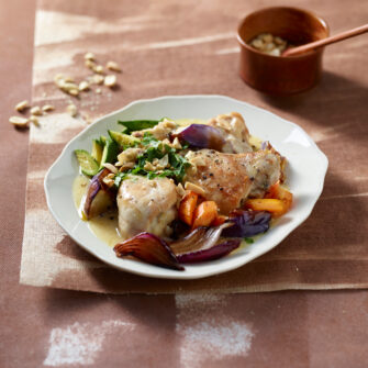 Se preferite, potete versare la salsa di arachidi sulle verdure per poi completare con il kecap kanis a filo, e finire con lo scalogno rosolato e le chip di gamberi.