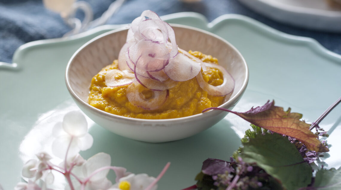 Divertitevi a tirare la pasta a mano sul grande tavolo della cucina. La sfoglia sottile abbraccia, lasciandolo intravedere, un ripieno di ortaggi invernali leggermente dolci e altamente depurativi: la zucca, la verza, i porri e le cipolle rosse, rinvigoriti da un pizzico peperoncino e da un’abbondante macinata di pepe nero. I ravioli “aperti” richiedono una doppia cottura, prima nel cestello della vaporiera e subito dopo nel forno già caldo, cosparsi di semi di sesamo, briciole di pane integrale e latte di cocco, che mantiene morbido l’impasto senza inumidire eccessivamente il gratin.