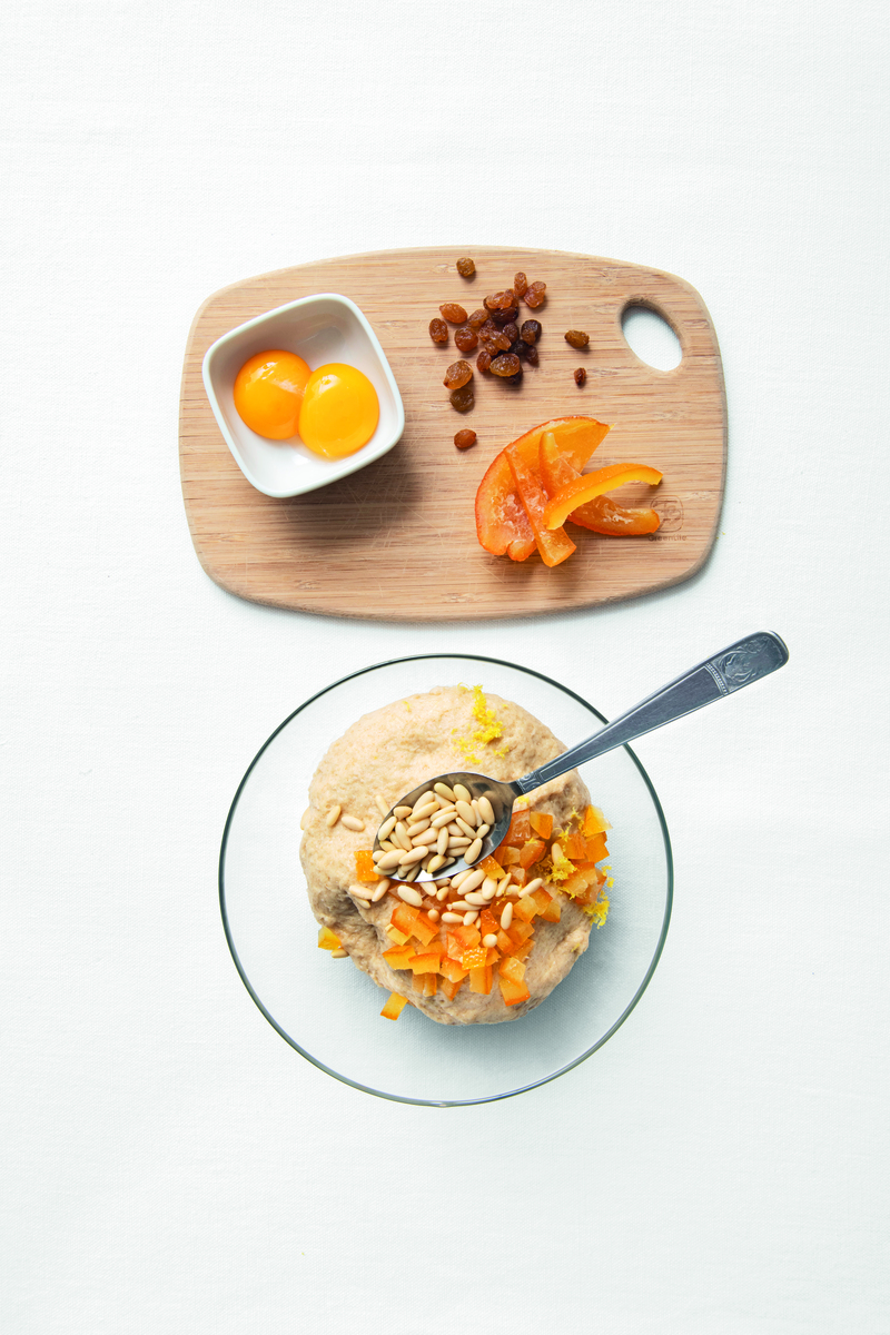 1) Mettete a bagno l'uvetta in acqua. Stemperate il lievito in 250 ml di acqua tiepida con 1 cucchiaino di zucchero; quando sarà ben sciolto, mescolate il mix con la farina, l'olio di semi, 85 g di zucchero semolato, i tuorli, la scorza grattugiata del limone e un pizzico di sale. Lavorate il composto fino a renderlo compatto; incorporate infine l'uvetta scolata, l'arancia candita a pezzetti e i pinoli, e fate lievitare l'impasto per 3 ore.