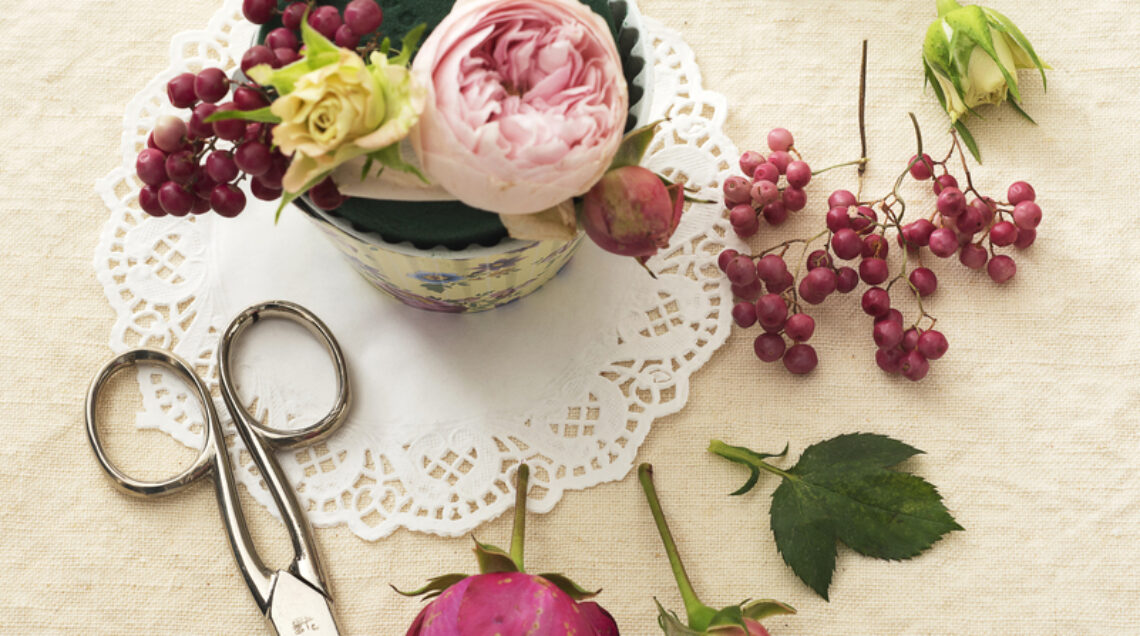 2) Accorciate i gambi delle roselline, eliminando anche eventuali spine e la maggior parte delle foglie. Iniziate la composizione infilando nella spugna alcuni rametti di bacche di pepe rosa, lasciandoli debordare leggermente.