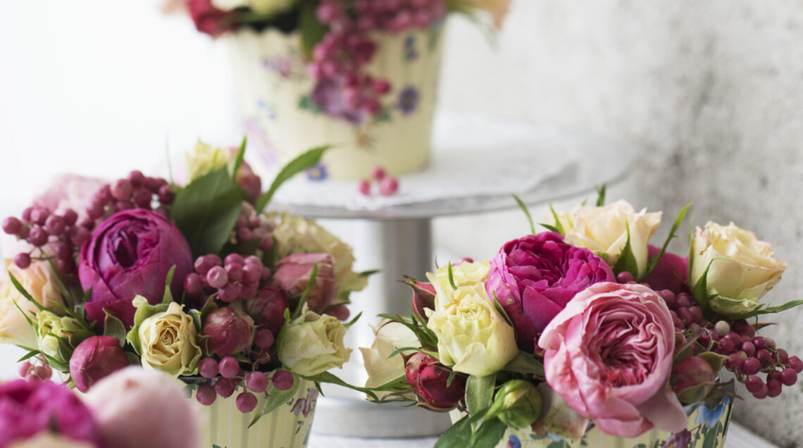 Preparazione ed esecuzione occorrente: 6 piccoli cachepot con lato esterno in cartoncino decorato e parte interna in leggero metallo, comprensivi di oasis (in vendita presso i negozi di attrezzature per fioristi e i garden center) - 8-10 rametti di bacche di pepe rosa (Schinus molle) - 1 mazzetto di roselline avorio - 1 mazzetto di roselline rosa e fucsia
