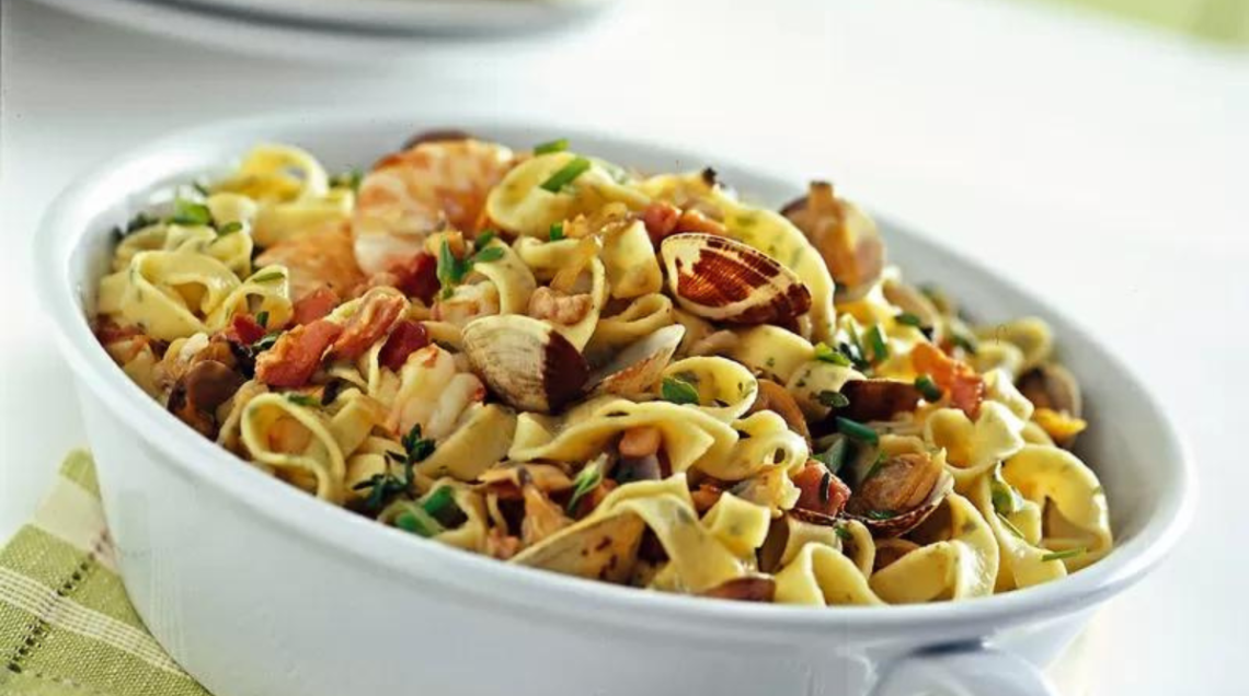 300 g di semola di grano duro - 3 uova - 3 rametti di maggiorana e 3 di timo - 4-5 steli di erba cipollina - 5-6 rametti di prezzemolo - 500 g di vongole veraci medie -500 g di gamberi - 2 fette di pancetta affumicata - uno scalogno - uno spicchio d'aglio -una foglia di alloro - un dl di vino bianco secco - olio extravergine d'oliva - sale, pepe