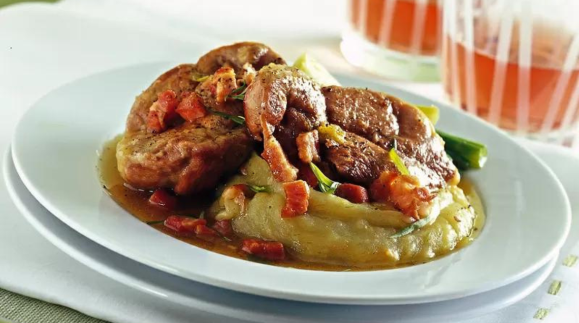 3) Prelevate le patate e i cipollotti dal fondo di cottura e frullateli rapidamente nel mixer fino a ottenere un purè omogeneo. Unite i cipollotti rimasti al fondo di cottura e cuoceteli con l'agnello per altri 5 minuti. Cospargete con una macinata di pepe e servite con il purè preparato.