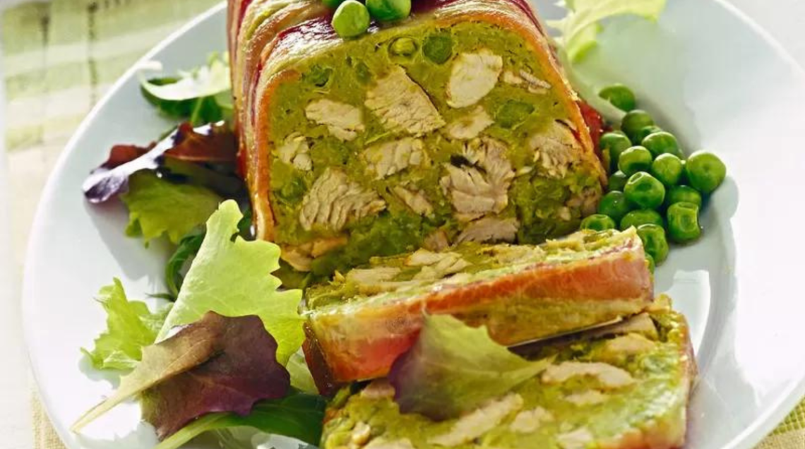 3) Foderate uno stampo da plum cake di 1,2 litri prima con carta da forno e poi con le fette di pancetta leggermente sovrapposte; riempitelo con il composto di carne e piselli, piegatevi sopra le fette di pancetta che sbordano e cuocete in forno a 180° per 45 minuti. Fate raffreddare la terrina e servitela a fette con le insalatine.
