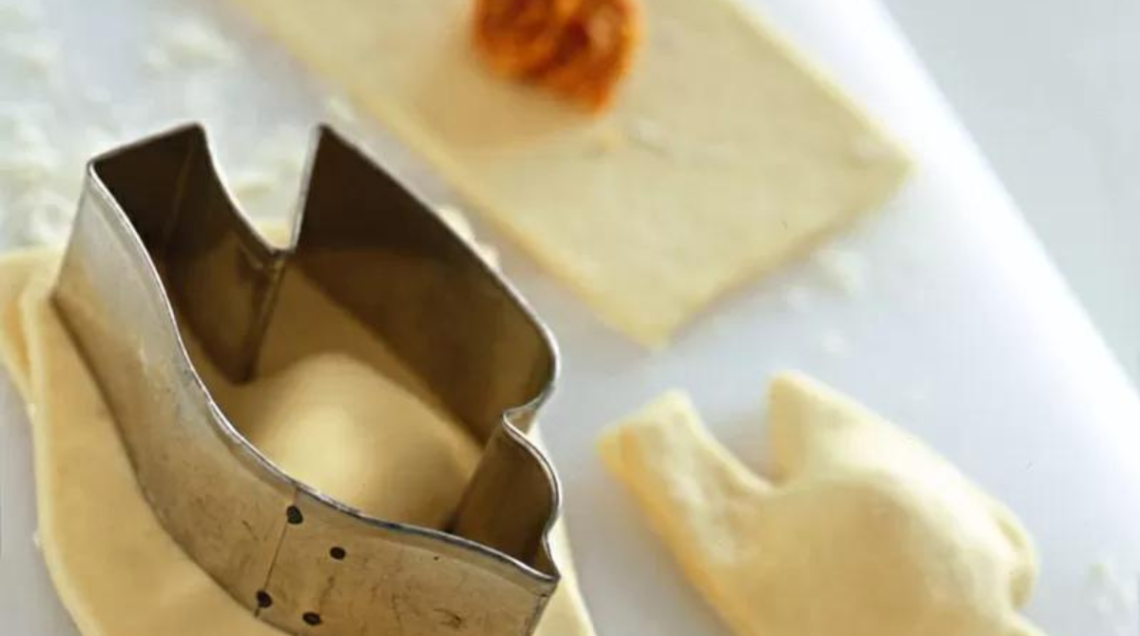 3) Ritagliate tante colombine, come si fa con i ravioli, usando un tagliapasta sagomato lungo 9 cm. Trasferitele su una placca rivestita con carta da forno, fatele lievitare per 30 minuti e poi infornatele a 180° per 10 minuti. Frullate le erbe aromatiche nel mixer con una presa di sale e 6 cucchiai di olio. Servite le colombine tiepide o fredde con il pesto.
