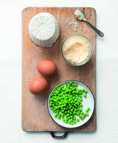 350 g di ricotta romana - 4 uova - 100 g tra parmigiano reggiano Dop e provola grattugiati - 100 g di pisellini in scatola (peso sgocciolato) -1 piccola cipolla - qualche goccia di succo di limone - olio extravergine d'oliva - sale - pepe