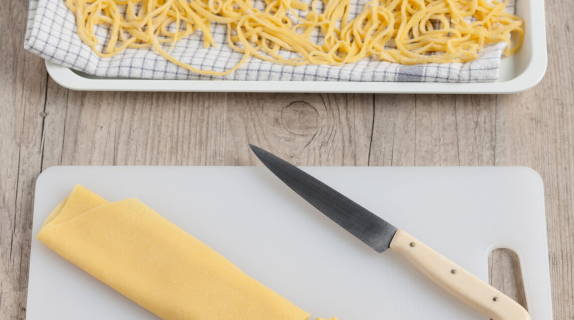Si può aggiungere un filo di olio, ma mai acqua, occorrono poi braccia robuste per lavorare la pasta e tirarla in una sfoglia sottilissima con esperti movimenti di “pressia”, un lungo e robusto matterello, e un abile lavoro di mani e di coltello (una volta si utilizzava la “cotela”, dalla lama sottile e affilata, ricavata per lo più dalle falci da fieno) per arrotolarla senza farla attaccare e tagliarla poi a fettine strette, il più possibile regolari. Un esercizio di precisione e di velocità che ancora oggi cuochi ed esperte casalinghe praticano senza mai alzare il coltello dalla spianatoia.