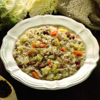 Protagonista anche nel riso e verza (virz’e rise) campano, nel minestrone alla milanese (la versione robusta prevede anche riso, lardo e cotenna), nella paniscia alla novarese (risotto con verza, fagioli e salam d’la duja, salame tipico piemontese, foto sopra).