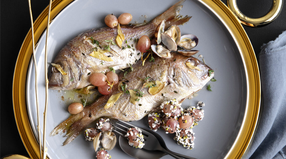 La carni bianche e tenere del pesce sono vivacizzate con lo zenzero e cotte al forno con il sughetto delle vongole. Audace e ben riuscito l'abbinamento con i chicchi di uva caramellata e insaporita da spezie e riso soffiato. Un secondo gourmet