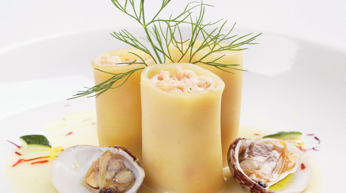 Un formato speciale di pasta fresca incontra pregiati molluschi e una dolcissima crema di verdura. Con pecorino romano di rinforzo