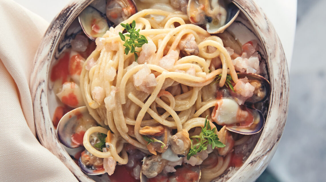 Una semplice pasta di pesce che diventa gourmand, con gallinella e guazzetto di molluschi profumati al porto bianco