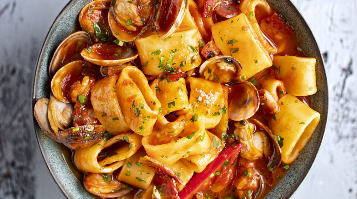 Calamarata all’arrabiata con vongole e pancetta affumicata