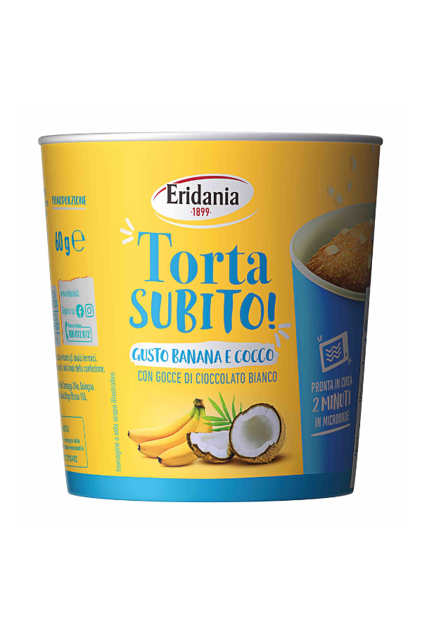 Bastano 3 semplici gesti e 2 minuti di microonde e la vostra torta sarà pronta! Merito di Eridania che ha appena lanciato sul mercato "Torta subito" in tre gusti: cioccolato con gocce di cioccolato fondente, carota con gemme all'arancia e cocco e banana con gocce di cioccolato bianco. Basta aprire il vasetto e miscelare il contenuto in 50 ml di acqua; mettere il vasetto nel microonde a 800 watt per 2 minuti e 10 secondi ed è subito pronta, soffice e calda