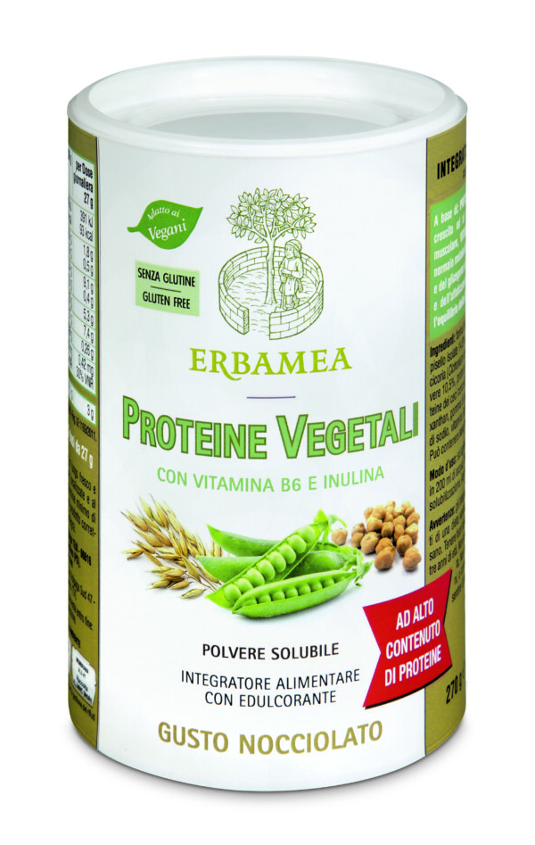 Per un pieno di energia è bene tenere a portata di bicchiere le Proteine Vegetali Erbamea al gusto nocciolato; se si è stanchi e stressati, se si seguono diete ipocaloriche, vegetariane e vegane o, ancora, per sopportare meglio il caldo estivo, basta assumere una volta al giorno 27 g di polvere (2 misurini rasi) sciolti in 200 ml di acqua, latte o altra bevanda. Gli ingredienti sono: proteine vegetali a base di farina di avena e proteine di pisello, ceci, riso, vitamina B6 e Inulina