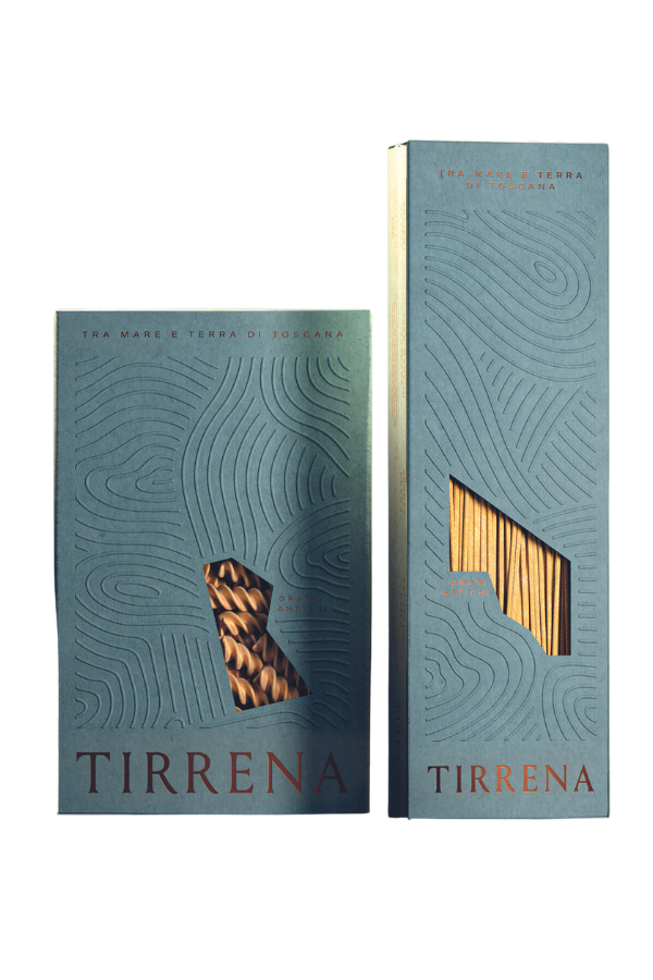 Tra mare e terra di Toscana nasce la pasta Tirrena creata con grani antichi di varietà Cappelli, Khorosan ed Evoldur. L’essiccazione naturale consente di conservare inalterate le qualità organolettiche e il grano viene coltivato in un territorio ottimale, nelle tenute della famiglia Frescobaldi, grazie alla simbiosi tra clima mite e brezze del Mar Tirreno. La pasta è prodotta con semola semintegrale con maggior contenuto di fibre, polifenoli, germe di grano e vitamine. Si trova nei seguenti formati: spaghetti, fusilli, penne, tortiglioni, linguine e casarecce