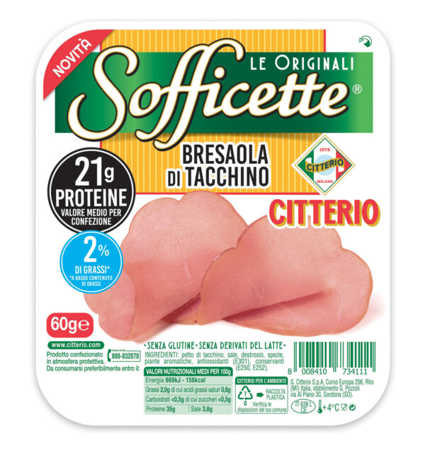 Pochi grassi e tante proteine sono l'atout della Bresaola di Tacchino Citterio realizzata con 100% petto di tacchino selezionato e stagionato; corrisponde all'identikit dell'alimento da consumare d'estate, garantisce gusto e sapore ed è versatile: infatti la bresaola di tacchino è protagonista abbinata a formaggi freschi e a verdure di stagione. Provatela con bruschette, ricotta e verdure grigliate, oppure come involtini con stracchino e asparagi e ancora con insalata di finocchi, scaglie di parmigiano e mandorle.