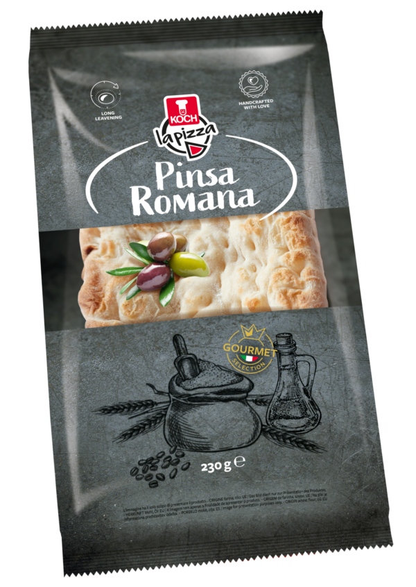 Croccante e irresistibile, la Pinsa Romana di Koch è surgelata, ma bastano pochi minuti sopra una griglia perché diventi fragrante come appena uscita dal forno; servitela con un filo d'olio d'oliva extravergine, prosciutto, mozzarella e olive; leggera, digeribile e versatile è senza additivi e conservanti; la trovate nel reparto surgelati