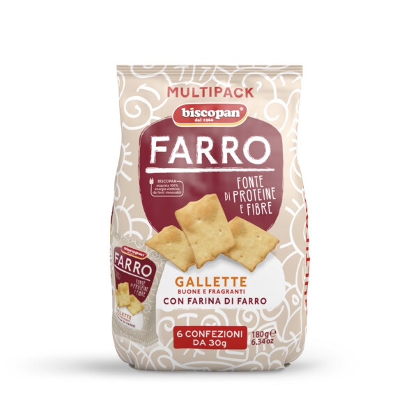 Deliziose da sgranocchiare, le Gallette al Farro di Biscopan sono leggere, nutrienti e digeribili, perfette da gustare sole o in abbinamento a salumi, formaggi, verdure, paté e per accompagnare aperitivi. Il farro, con le sue proprietà benefiche, dona a queste gallette un profilo nutrizionale ideale: basso contenuto di grassi e una carica di fibre e proteine. Qui in foto il formato Multipack da 180 g che racchiude 6 confezioni da 30 g l'una, facili da trasportare e pronte da gustare in ogni occasione