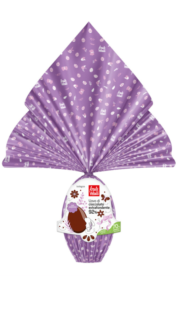 La Pasqua Bio all'insegna del gusto e della tradizione è proposta da Baule Volante, leader da oltre trent'anni nella distribuzione di prodotti biologici. Per celebrare la Pasqua in catalogo si trovano colombe, dolci pasquali, ovetti di cioccolato e le irrinunciabile uova di cioccolato biologico, dolcificate solo con zucchero di canna, proposte in tre varianti: al latte, al cioccolato fondente 70% e al cioccolato extrafondente al 92% dedicato ai veri intenditori (qui in foto); la sorpresa è realizzata in legno sostenibile e tutte le uova in catalogo sono confezionate con il 70% di plastica riciclata.