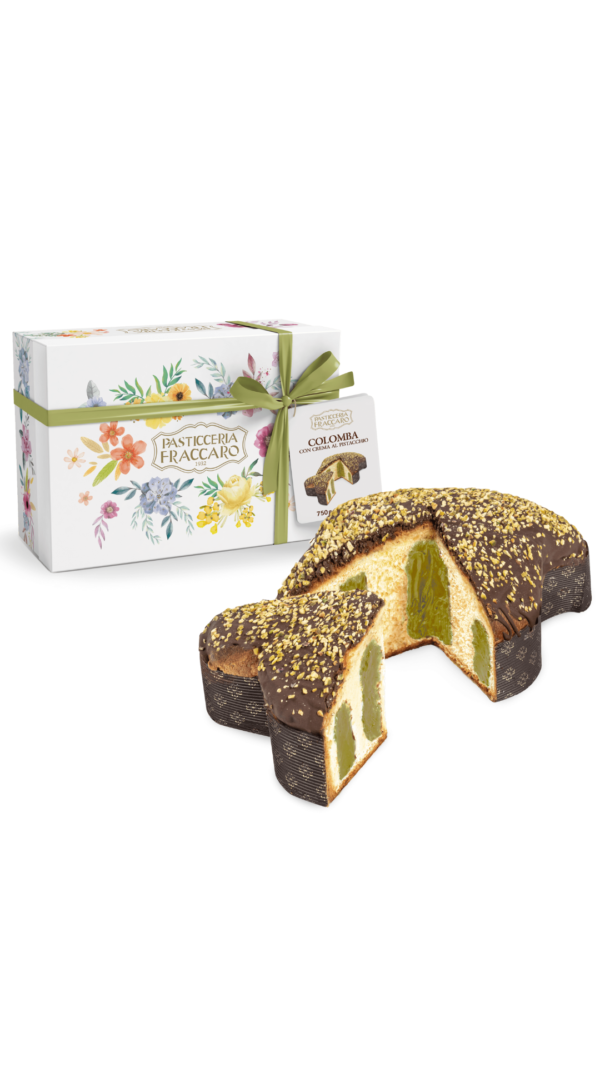 Da 90 anni Fraccaro Spumadoro è sinonimo di tradizione e arte dolciaria. I suoi atout sono la lavorazione artigianale degli impasti, il lievito madre che dal 1932 viene sempre rinfrescato e custodito, mantenendo aromi e sapori unici e introvabili. Quest'anno le proposte vanno dai classici della tradizione ai sapori più innovativi come la colomba al cocco e cioccolato, al caramello salato, al gianduia, alle ciliegie e cioccolato, al pistacchio, alla crema al limone e alla pesca e mandorle. In foto la colomba al pistacchio cattura il palato grazie alla fragranza dell'impasto lievitato naturalmente e la morbida crema di pistacchio di primissima qualità; la glassatura è al cioccolato con granella di croccante pistacchio.