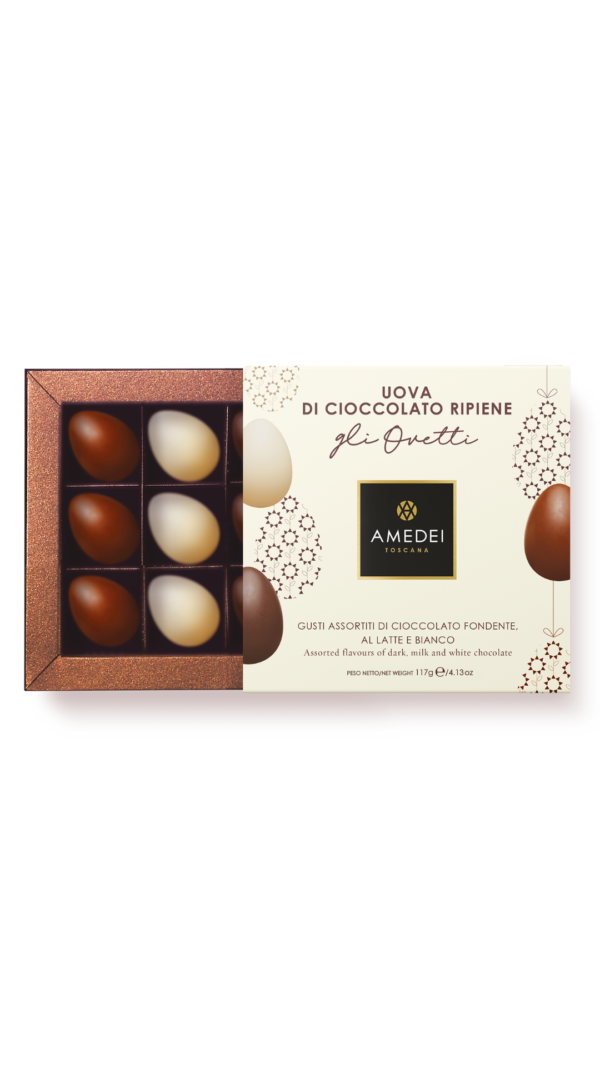 Dalla pluripremiata azienda toscana AMEDEI, che da 30 anni è impegnata nella produzione di cioccolato d'eccellenza, nascono i golosissimi Ovetti proposti in tre gusti: guscio di cioccolato fondente al 66% ripieno di cioccolato alla mandorla; guscio di cioccolato bianco ripieno di cioccolato alla nocciola; guscio di cioccolato al latte ripieno di cioccolato gianduja. Tutto il cioccolato di alta qualità prodotto da Amedei nasce da semi di cacao rari e pregiati dell'Africa e del centro America, lavorati con metodo artigianale. E tutti i packaging della Nuova Collezione di Pasqua, che comprende altre prelibatezze vellutate al palato, sono rivestiti da carta ottenuta dal riciclo delle bucce di cacao.