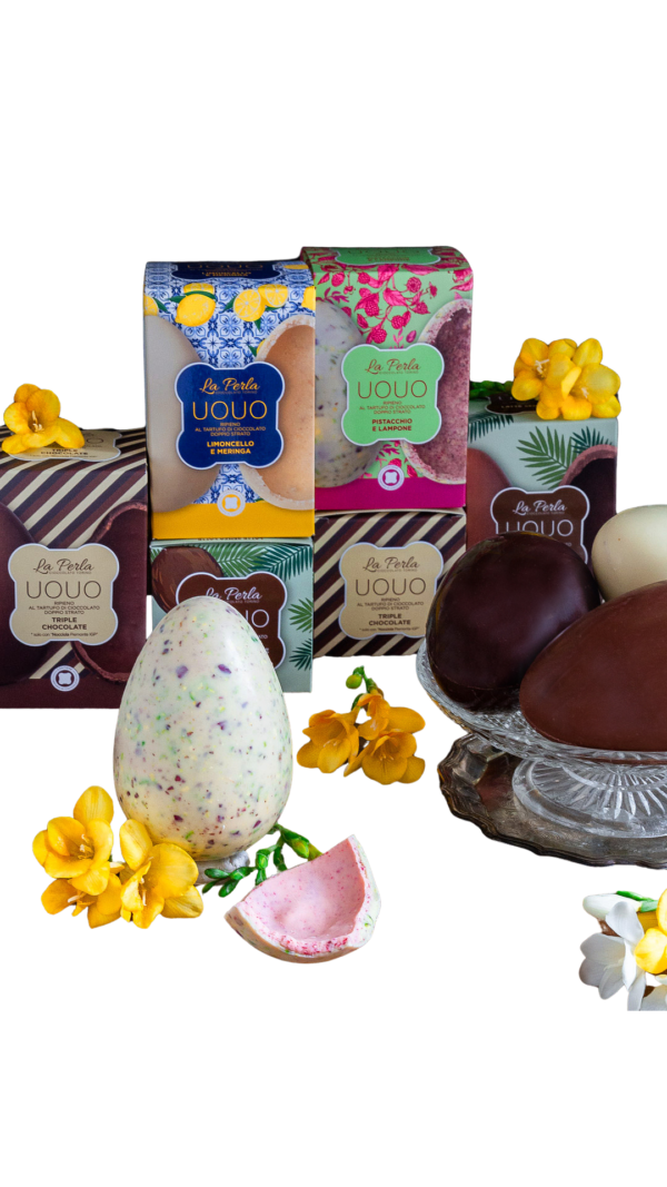 Le nuove uova UOUO firmate La Perla di Torino rappresentano una novità per il brand torinese, veri e propri capolavori di maestria artigianale: le uova a doppio strato hanno all'esterno un vellutato guscio di cioccolato e all'interno un cremoso strato di tartufo di cioccolato con croccanti inclusioni spalmato a mano; quattro i gusti: dal fondente Triple Chocolate al vegano Latte senza Latte, dal Limoncello e Meringa al Pistacchio e Lampone. La sorpresa è un tartufo di cioccolato per prolungare il piacere delle papille gustative.