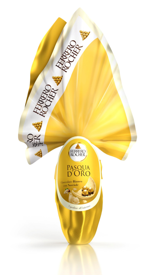 Ferrero, marchio conosciuto in tutto il mondo, propone le Uova Pasqua d'Oro Ferrero Roche in tre versioni: al cioccolato bianco con croccante granella di nocciola e 3 Ferrero Rocher al suo interno (in foto, 212,5 g,€ 10,99); al cioccolato al latte e a quello fondente con sorpresa Ferrero Rocher Dark; oltre a questi troverete anche le Uova Ferrero Collection al latte e cacao, quelle al cioccolato fondente e cacao ed extra fondente e cacao (250 g + 3 praline, € 11,99); infine gli ovetti di cioccolato ripieni Golden Eggs (126 g, € 3,99), senza dimenticare quelli famosissimi tra i più piccoli: gli ovetti Kinder con meravigliose sorprese e messaggi positivi riportati sul pack (€ 1,39)