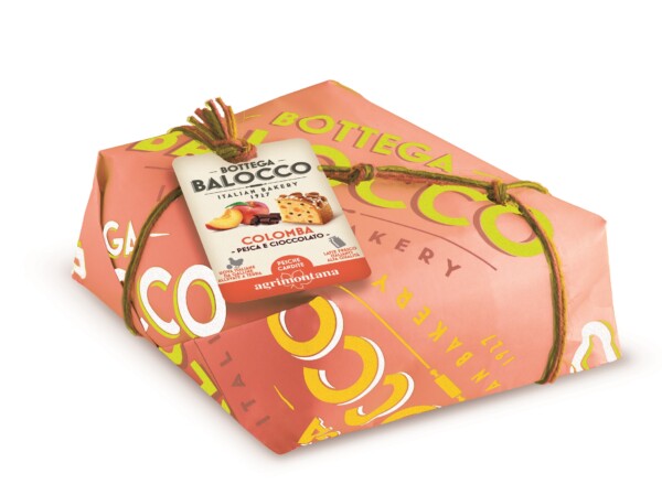 Il capolavoro d'arte pasticciera firmato Bottega Balocco – Italian Bakery 1927 è la Colomba Pesca e Cioccolato realizzata con uova di galline allevate a terra, latte fresco d'alta qualità, lievito madre, cioccolato extra fondente e nocciole intere italiane per la glassatura. In armonia con il cioccolato si trova la pesca candita secondo la tradizione Agrimontana solo con sciroppo di acqua e zuccheri, senza coloranti né aromi artificiali