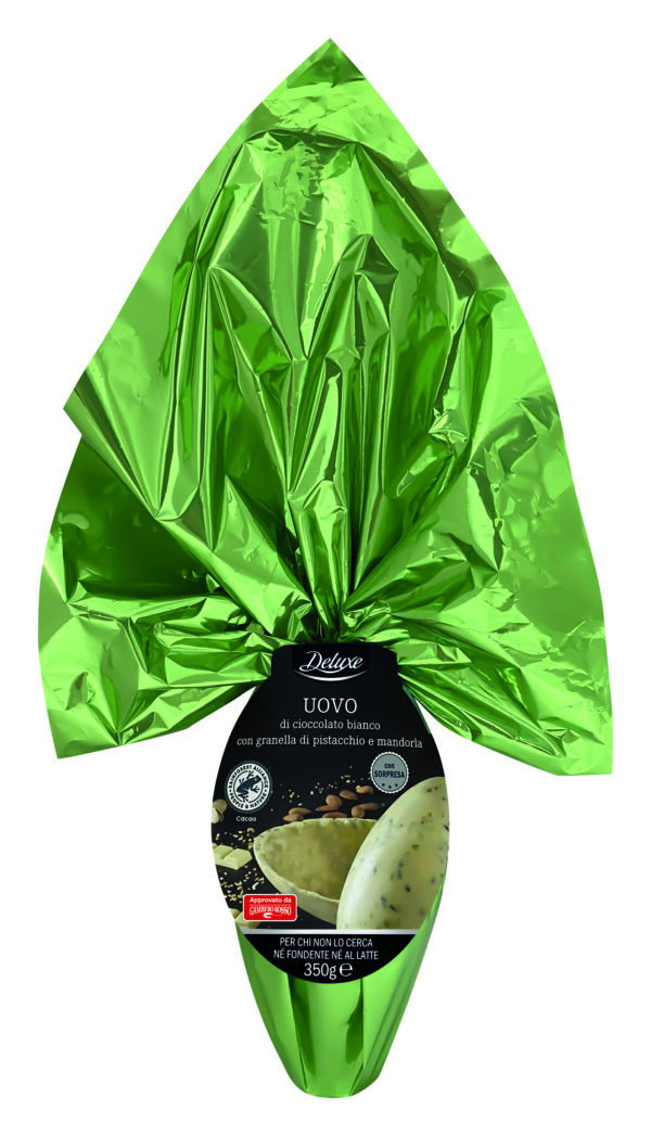 Le uova al cioccolato della linea Deluxe si trovano sugli scaffali di Lidl Italia in tre golose interpretazioni: al latte con caramello al burro salato, al latte con nocciole intere e infine al cioccolato bianco con granella di mandorle e pistacchi (in foto) dedicato ai più golosi, con un guscio dolce e spesso che lascia al palato uno sfizioso sapore salato