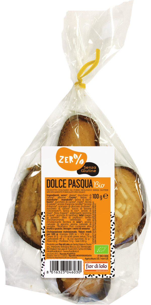 Dal 1978 l'azienda toscana Probios è leader nei prodotti biologici, gluten free, senza zuccheri aggiunti e vegan. Come questo dolce pasquale senza uova, burro e latte, con pasta madre a lievitazione lenta e naturale per una consistenza soffice e fragrante; il tutto arricchito da agrumi canditi che donano un sapore intenso ed equilibrato