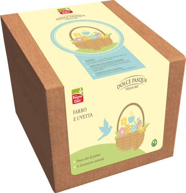 Il Dolce Pasqua farro e uvetta bio de La Finestra sul Cielo soddisfa tutti i palati, compresi quelli di coloro che seguono un'alimentazione vegana. La consistenza è soffice grazie alla lievitazione naturale, con pasta madre, uvetta sultanina e farina di farro, senza olio di palma e certificato “vegan ok”
