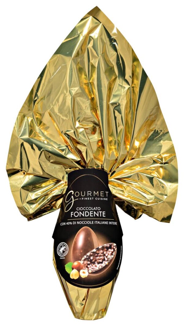 A Pasqua non può mancare l'uovo di cioccolato. Questo della linea Gourmet Finest Cuisine di Aldi è dedicato ai chocolate lover: cioccolato fondente certificato Rainforest Alliance con il 40% di nocciole intere che vanno a bilanciare il sapore tipicamente amaro