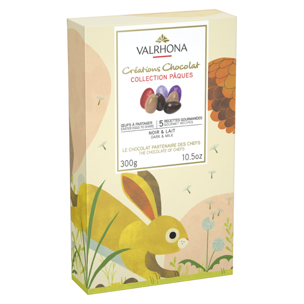 Soddisfa tutti i gusti il variegato assortimento di uova di cioccolato di Valrhona: pralinato al latte, scaglie di biscotti tipo gianduia, ganache fondente, cuori al caramello fondenti e al latte. Le uova da condividere sono custodite in un cofanetto sul quale sono riportate le illustrazioni dell'artista Benjamin Flouw e rappresentano un inno alla primavera