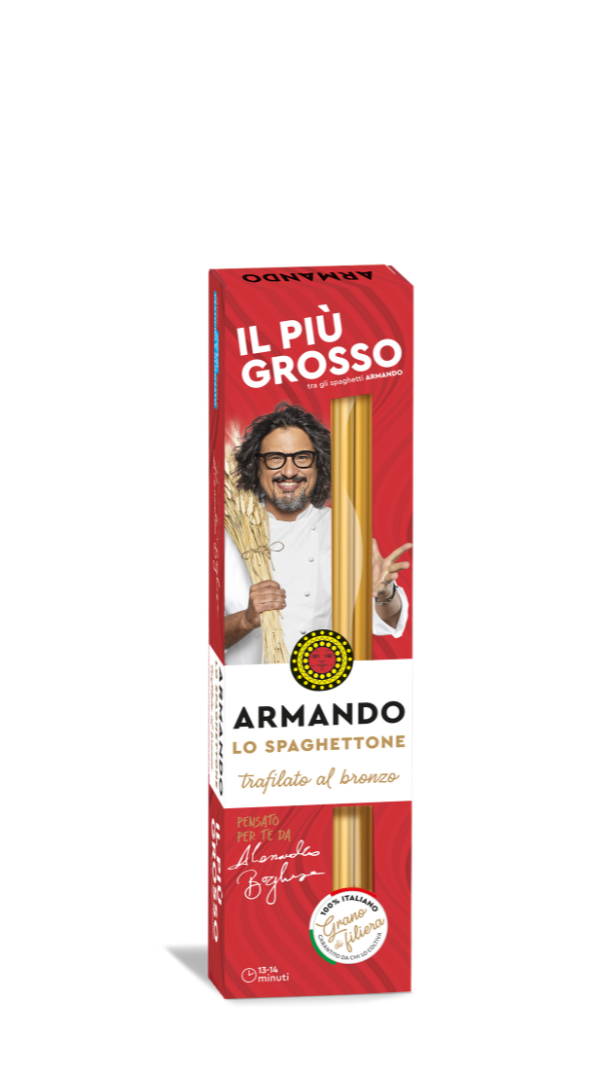 Il più grosso tra i formati di spaghetto proposti da Pasta Armando, prodotto con solo grano 100% italiano della Filiera Armando e realizzato in collaborazione con Chef Alessandro Borghese. Dalla trafilatura ruvida e dalla perfetta tenuta in cottura e al morso, è ideale per sughi tipici della tradizione. Come l’intera linea di Pasta Armando, Lo Spaghettone è certificato “Metodo Zero Residui di Pesticidi e Glifosato” da Bureau Veritas®.