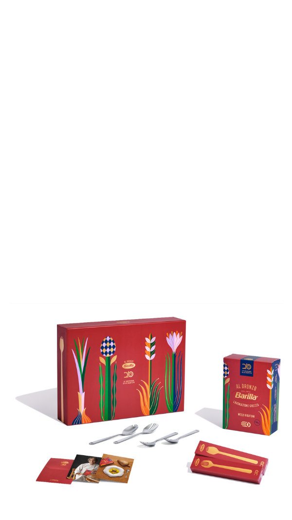 in vendita a partire dal primo novembre su Amazon. Comprende una confezione di Mezzi Rigatoni Barilla Al Bronzo, le posate