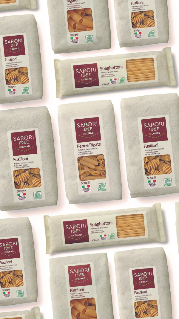 La nuova linea di prodotti Pasta di Semola Sapori&Idee Conad è realizzata con semola 100% di Grano Duro Italiano della migliore qualità, attraverso una grande cura nei dettagli del processo produttivo. La lenta essiccazione a bassa temperatura preserva sapori e profumi del grano e il colore naturale della semola. Grazie alla particolare trafilatura la pasta è ruvida e porosa, perfetta per trattenere ogni condimento. La nuova offerta si compone di 18 referenze.