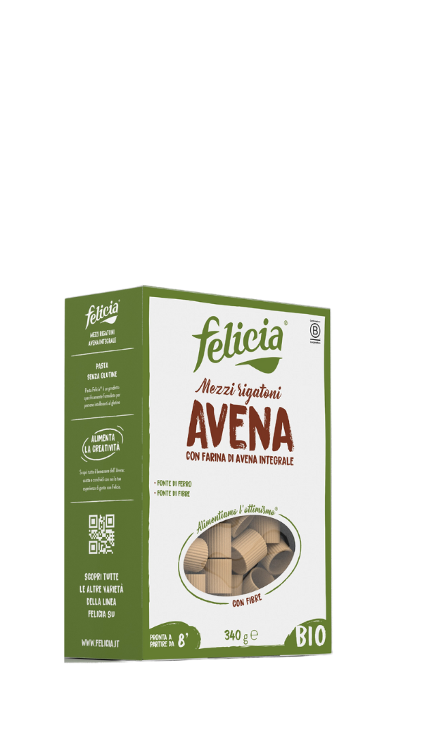 Disponibile in ben cinque formati (Mezzi Rigatoni, Penne, Ditalini, Caserecce e Linguine), la pasta con Avena Felicia è biologica, senza glutine e realizzata con farina di avena integrale. Fonte di fibre e ferro, è buona per tutti e, in particolare, per coloro che scelgono di mangiar sano e naturale; il gusto delicato dell’avena la rende versatile ed adatta a molteplici abbinamenti in cucina, per piatti equilibrati, veloci e facili da preparare.