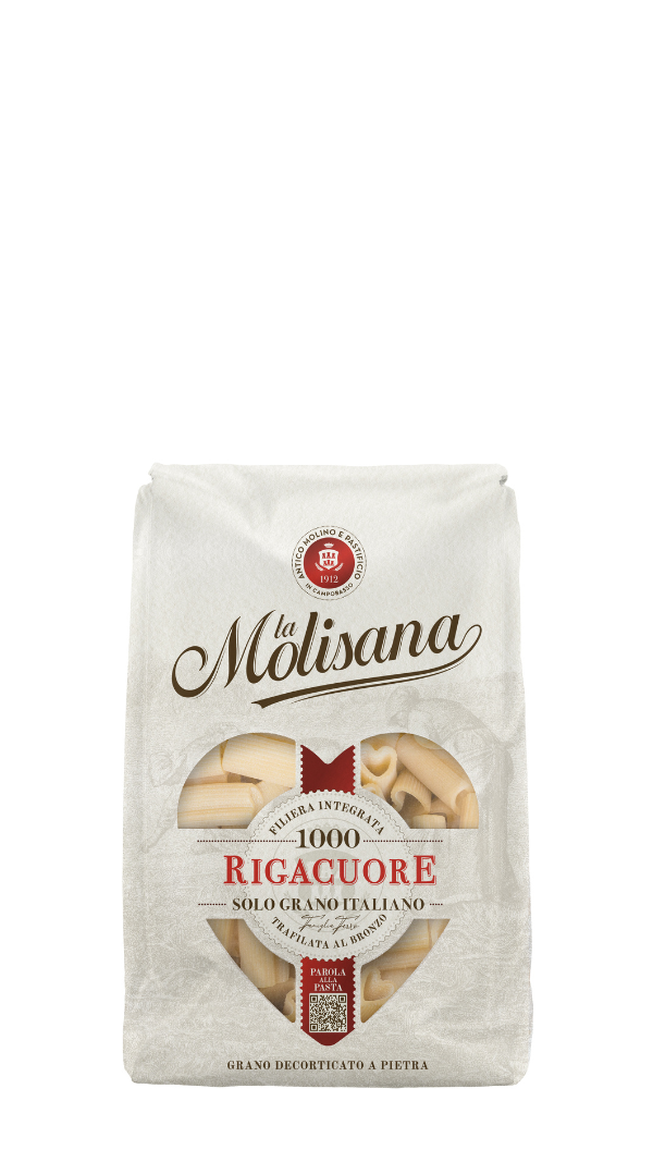 Romantico, divertente e trendy, Rigacuore La Molisana è l’innovativo formato di pasta che con la sua forma a cuore rende ancora più grande il piacere della pasta e comunica sentimento, romanticismo e positività. Rigacuore è la pasta a cuore supertenace, grazie a un elevato indice proteico, mai inferiore al 14%, nasce da grano 100% italiano e proviene da una filiera della pasta 100% integrata che parte dalla selezione accurata del chicco di grano per poi seguire ogni fase di produzione. Grazie alla trafilatura al bronzo, la superficie ruvida di Rigacuore cattura ogni tipo di condimento e la cottura è sempre uniforme in tutte le parti. La doppia piega di Rigacuore, infine, crea una maggiore corposità in bocca moltiplicando così il piacere stesso della masticazione.