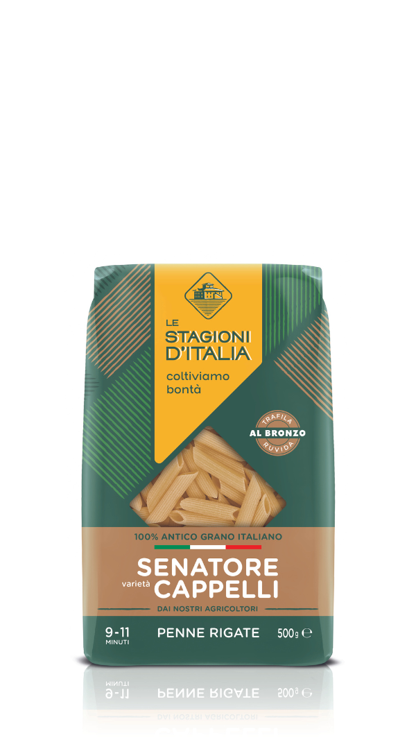 Le penne rigate Le stagioni d’Italia sono realizzate al 100% con semola di antico grano italiano Senatore varietà Cappelli, coltivato con cura e proveniente dal seme controllato e certificato da SIS (Società Italiana Sementi). L’impasto, composto da semola e acqua, viene trafilato al bronzo per garantire una pasta ruvida in grado di trattenere ogni condimento, mentre un controllo scrupoloso dell’essiccazione assicura il mantenimento delle caratteristiche nutrizionali e conferisce la peculiare porosità.