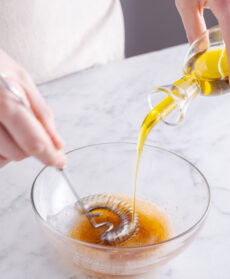 Versate a filo 4-5 cucchiai di olio extravergine, montando con la frusta, in modo da ottenere una salsa emulsionata.