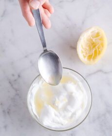 Mettete 100 yogurt greco o bianco al naturale (la salsa risulterà più fluida) in una ciotola e aggiungete 1 cucchiaio di succo di limone, poco sale, una macinata di pepe e 1/2 spicchio di aglio tritato