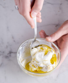 Versate a filo 2-3 cucchiai di olio extravergine delicato e amalgamate gli ingredienti con un cucchiaino.