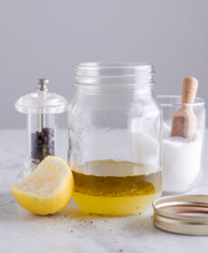 Disponete in un vasetto con coperchio a vite il succo di 1/2 limone, meglio se filtrato, 4-5 cucchiai di olio extravergine, sale e una macinata di pepe