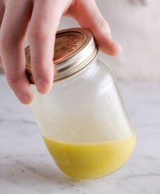 Chiudete il vasetto e agitatelo con decisione per 1 minuto, in modo da emulsionare gli ingredienti.